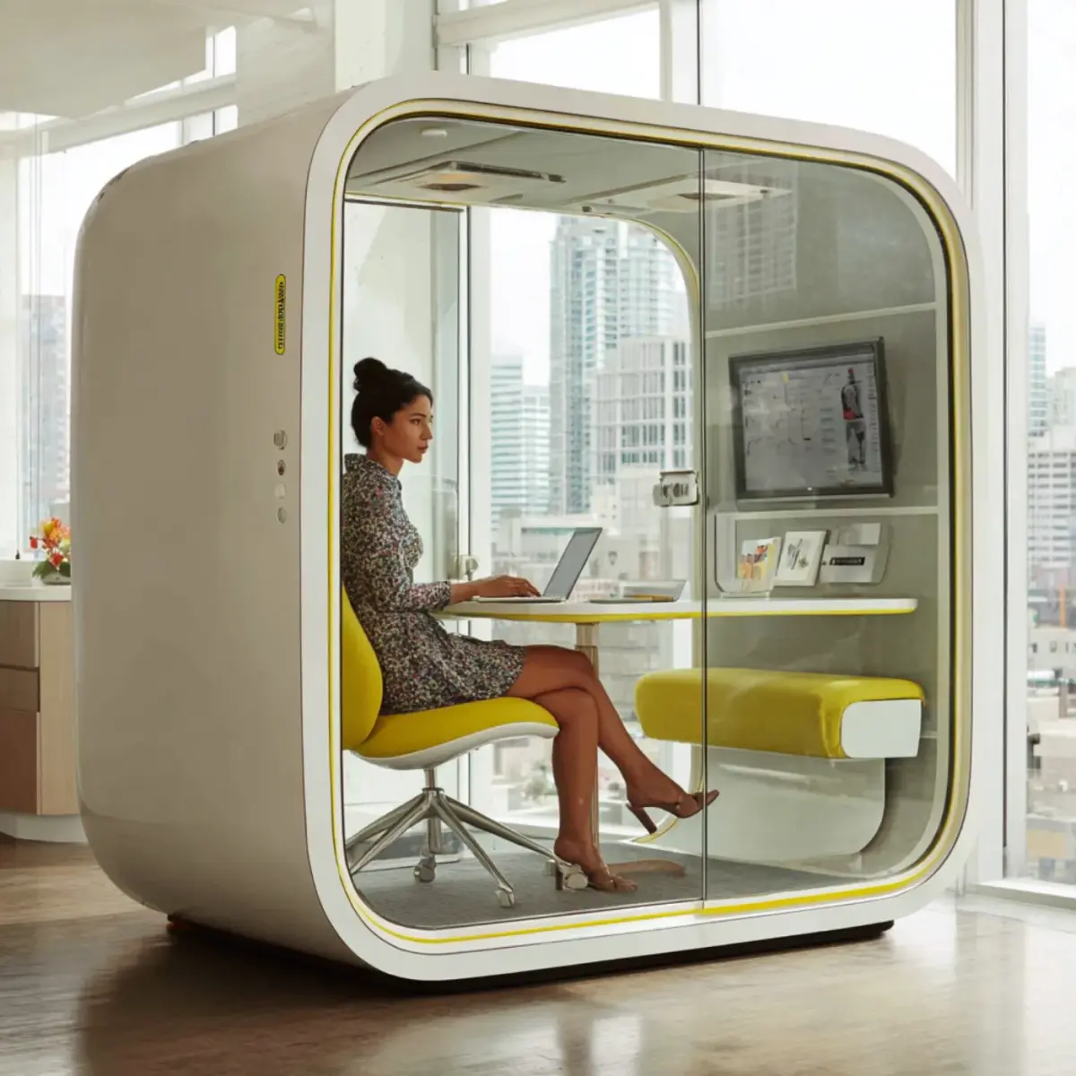 A pod in an office is a semi-enclosed or enclosed workspace designed for focused work, calls, or meetings. They vary from solo pods to group setups.